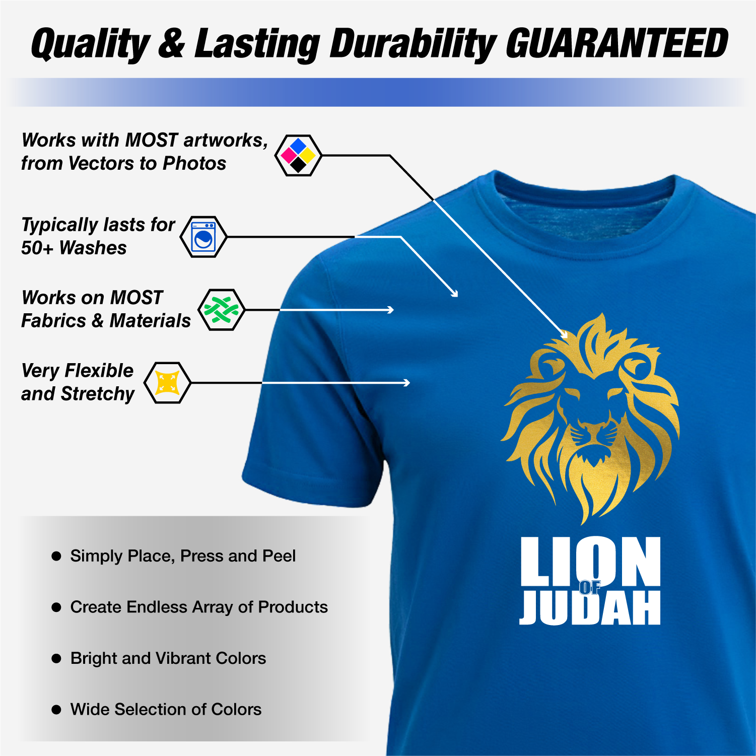 Prepress the shirt for at least 10 seconds under medium high pressure. to remove any moisture and creases. This guarantees the fabric is smooth and dry, providing an improved surface for the transfer and prevents the design to peel off or have unwanted defects.